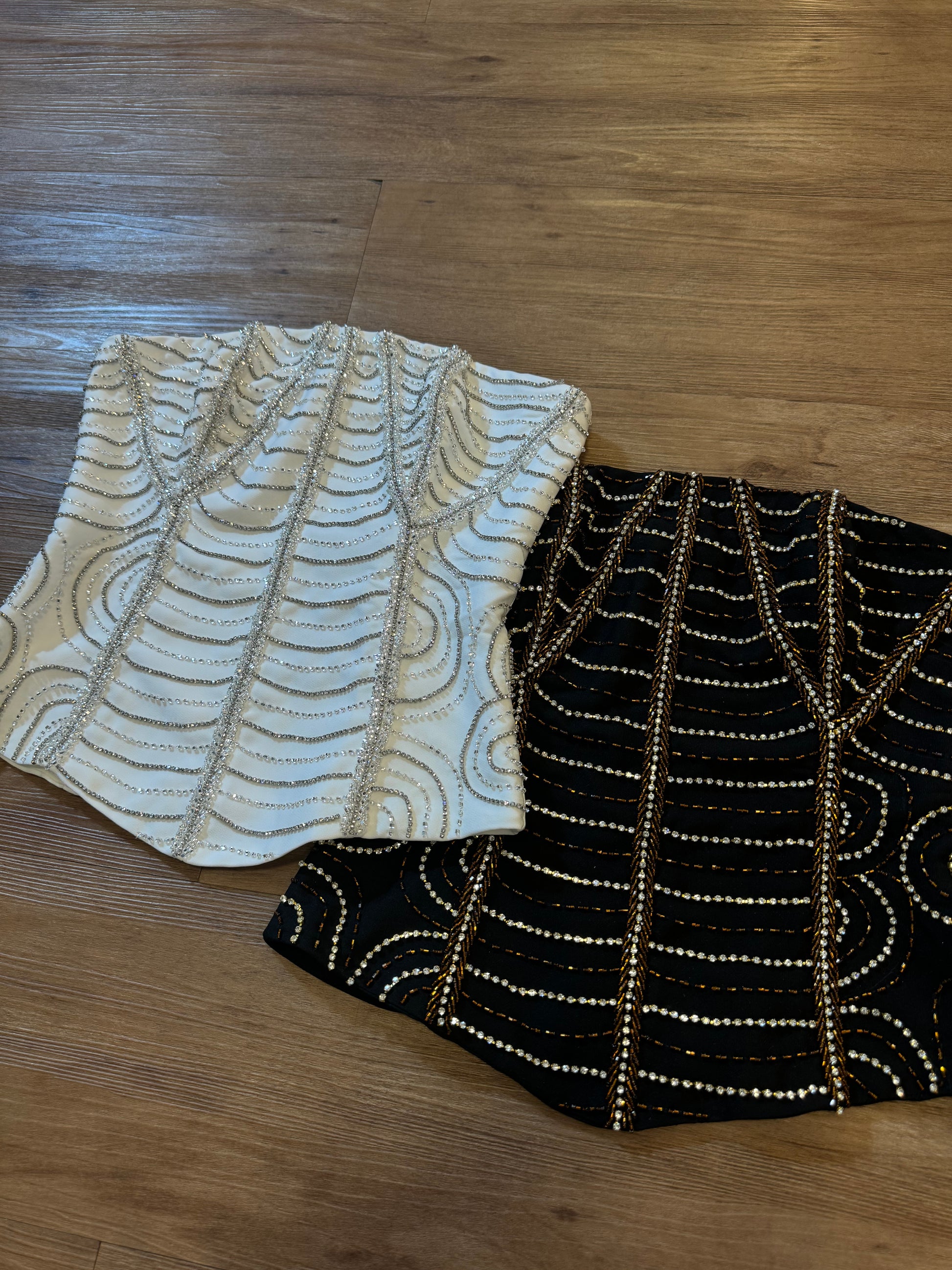 Com design tomara-que-caia e estrutura que valoriza a silhueta, o Corset Paris entrega um visual sofisticado, moderno e super poderoso. As pedrarias bordadas a mão desenham linhas elegantes ao longo do busto e cintura, criando um efeito visual luxuoso e cheio de atitude.