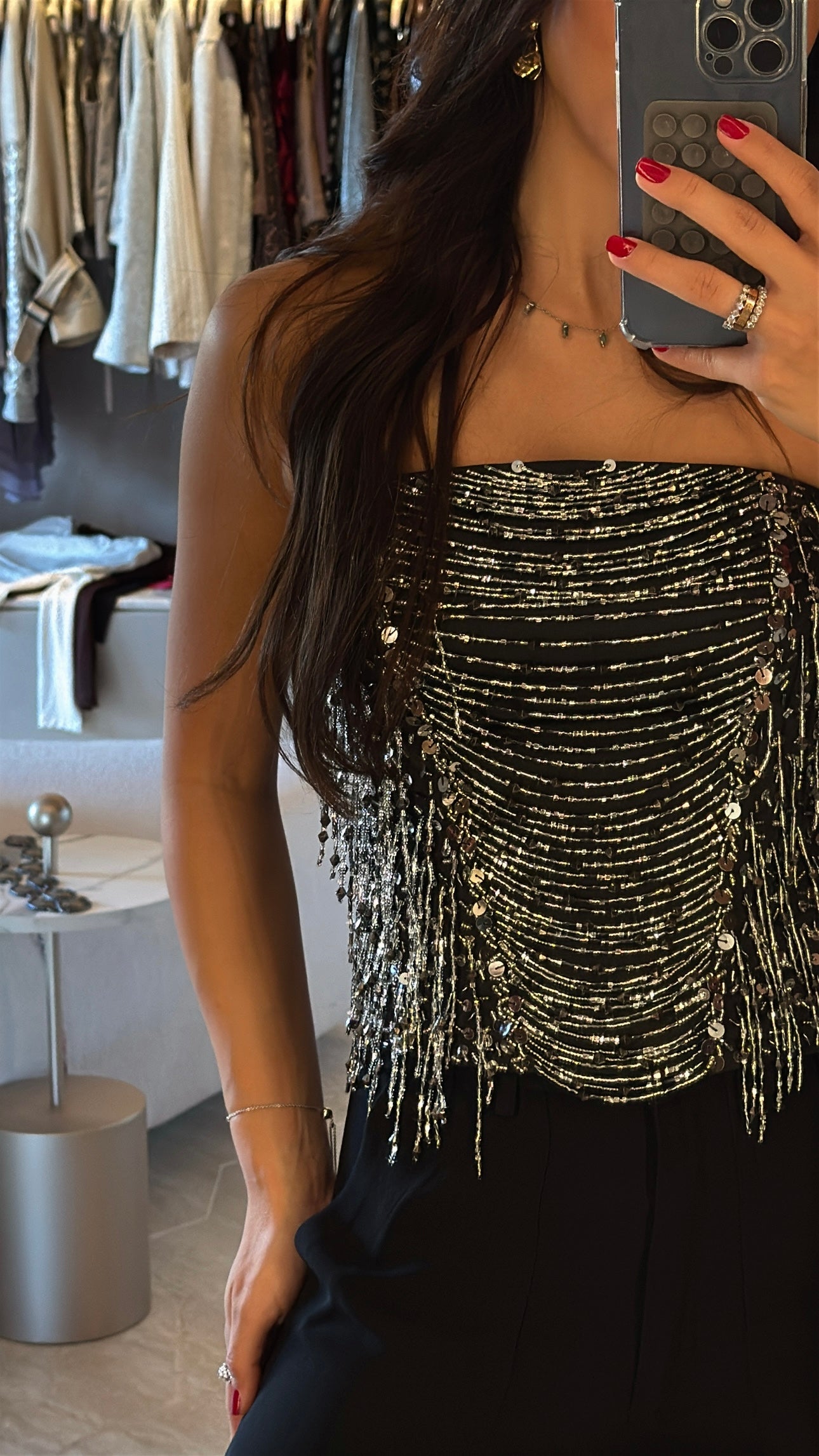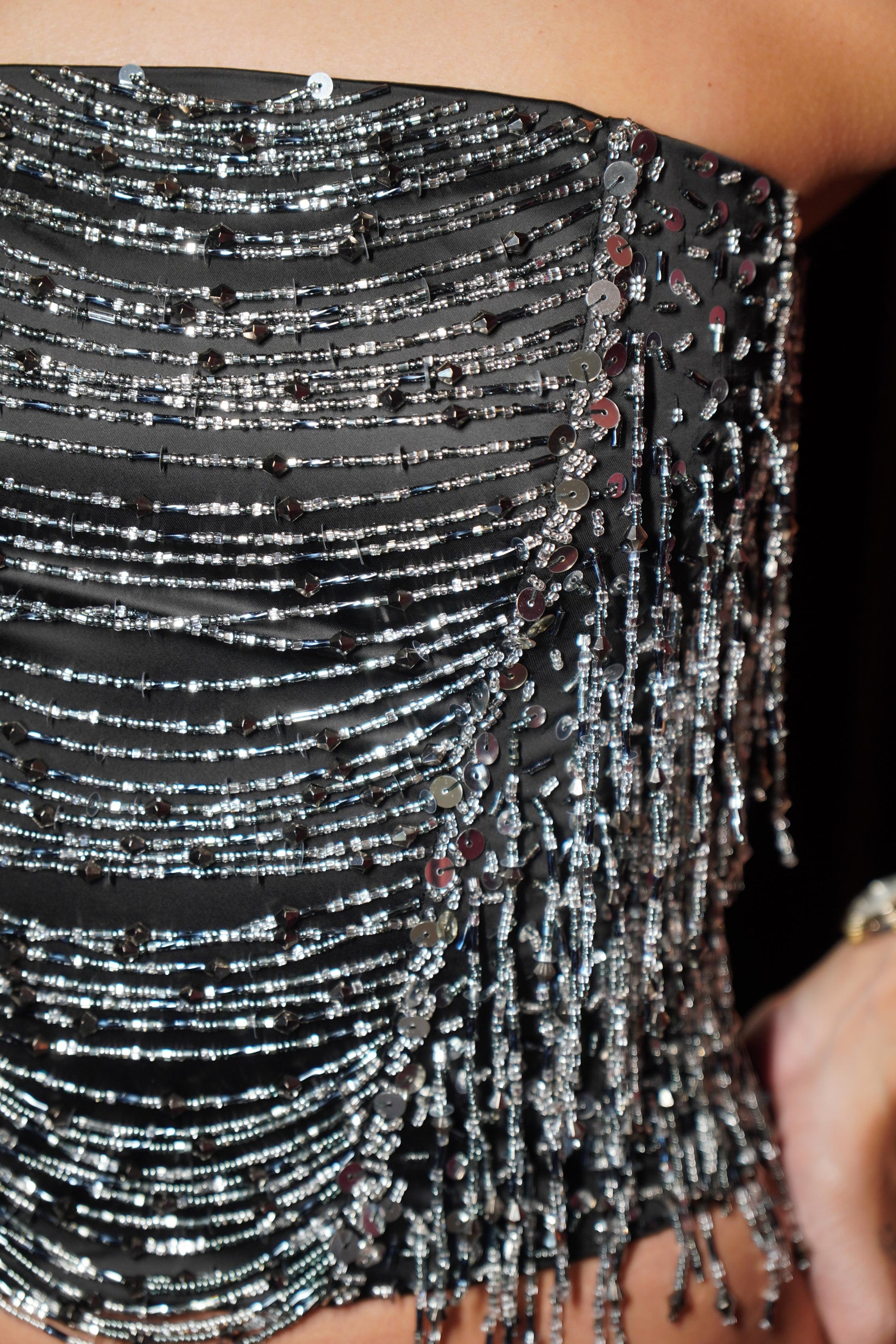 O Corset Soyo é uma peça sofisticada e cheia de personalidade. Confeccionado em crepe acetinado, o modelo se destaca pelo bordado artesanal feito à mão, com franjas, paetês e pedrarias, que trazem brilho e movimento únicos.