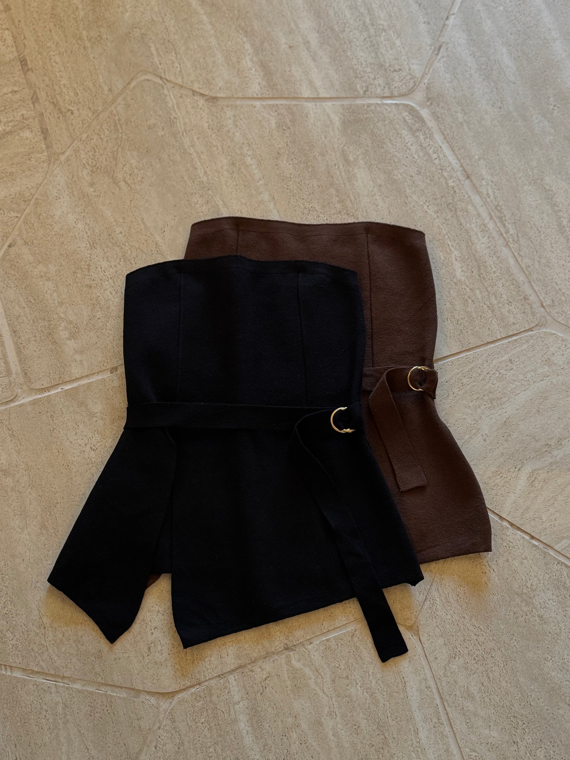 Tricot tomara que caia, com abertura na lateral e cinto para regularem na cintura.