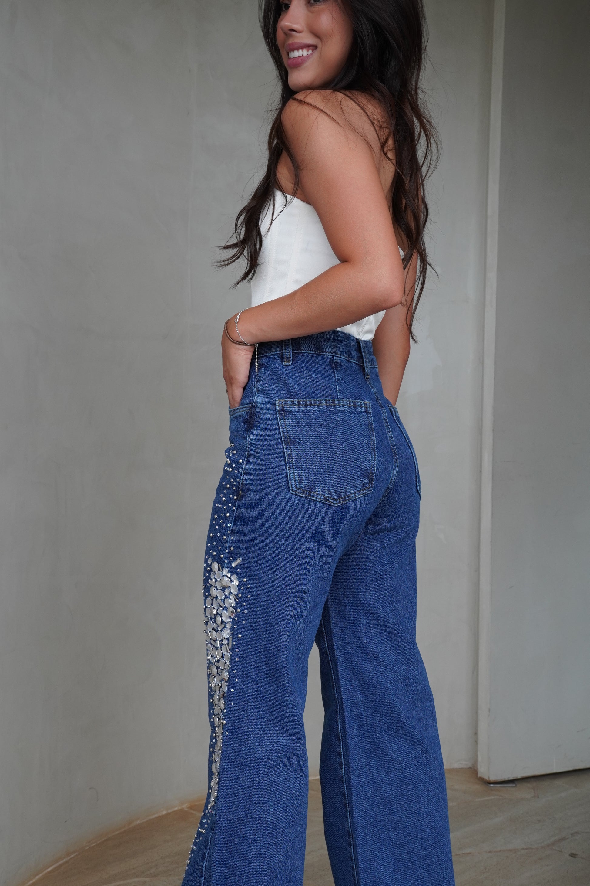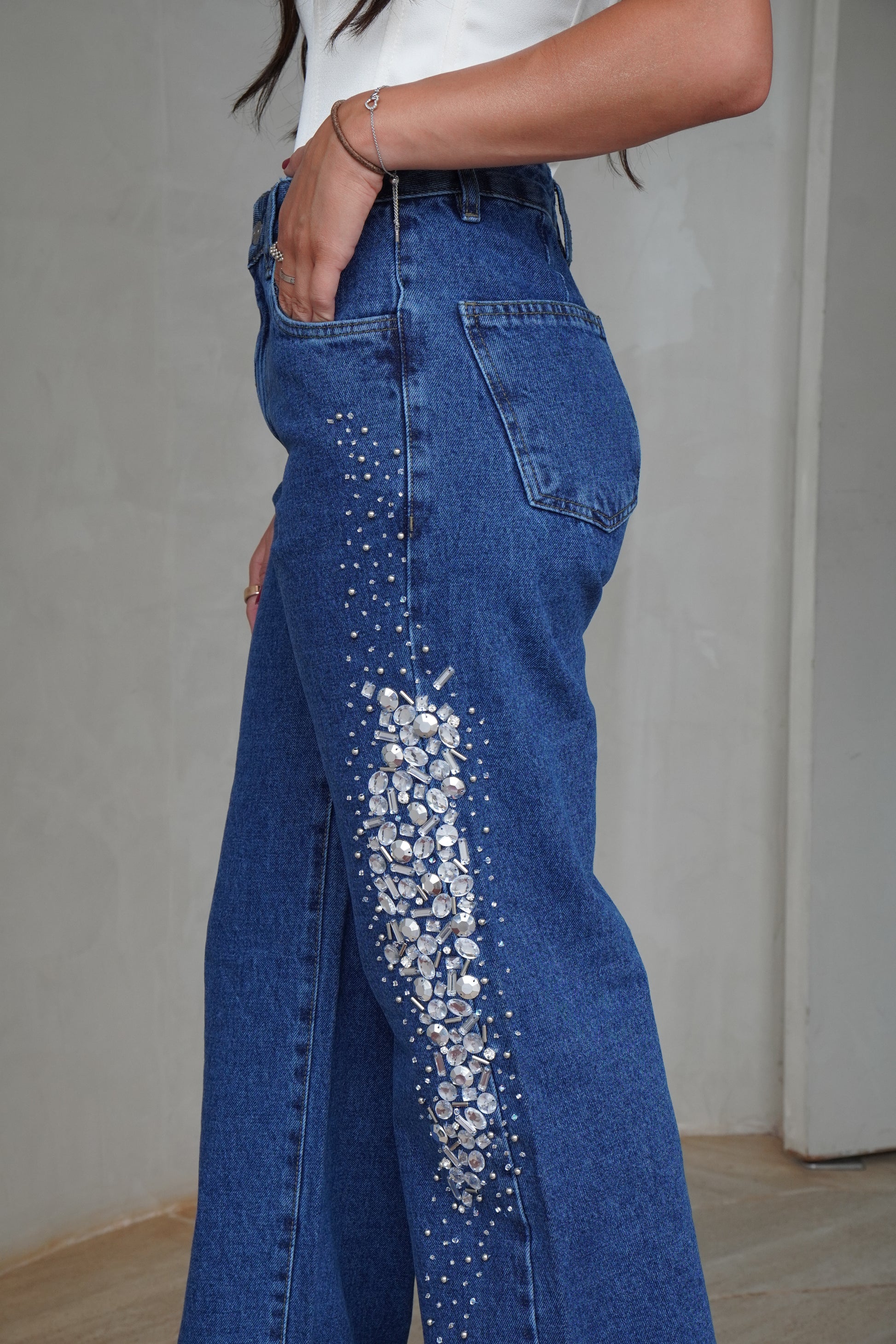 Calça New York em lavagem azul escura, com design atemporal e acabamento refinado. Os bordados em pedraria brilhante, feitos à mão, adicionam um toque sutil de elegância e exclusividade à peça.