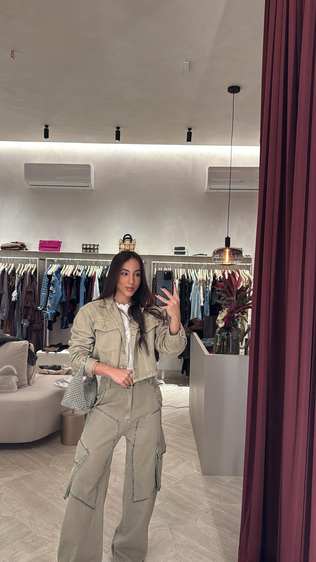 A modelagem ampla e os bolsos estruturados da Calça Toledo ganham destaque com o acabamento em bordados aplicados à mão, que percorrem todos os recortes e detalhes da peça, criando um efeito de brilho sofisticado e nada óbvio.