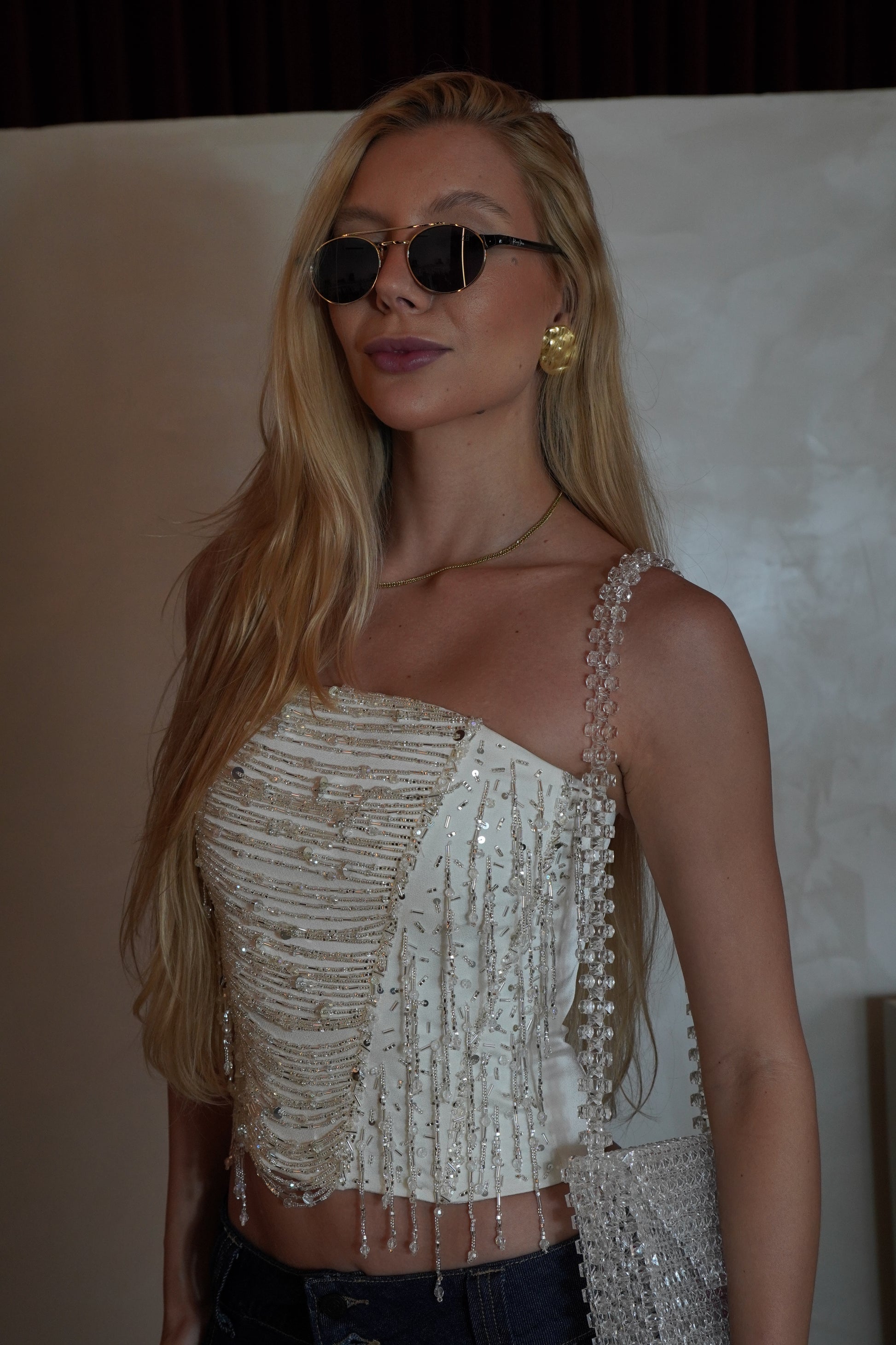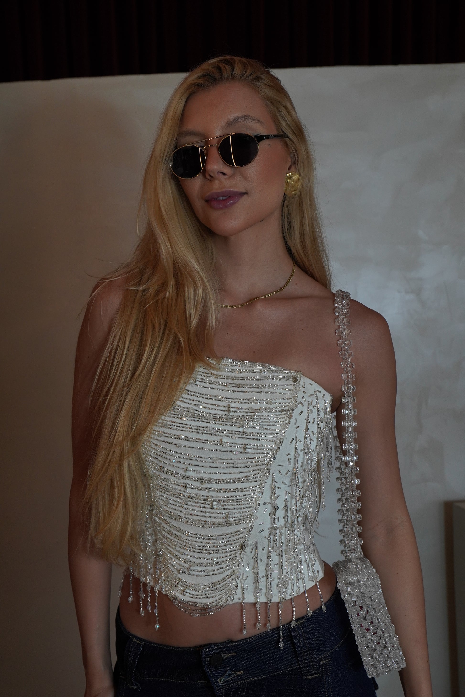 O Corset Soyo é uma peça sofisticada e cheia de personalidade. Confeccionado em crepe acetinado, o modelo se destaca pelo bordado artesanal feito à mão, com franjas, paetês e pedrarias, que trazem brilho e movimento únicos.